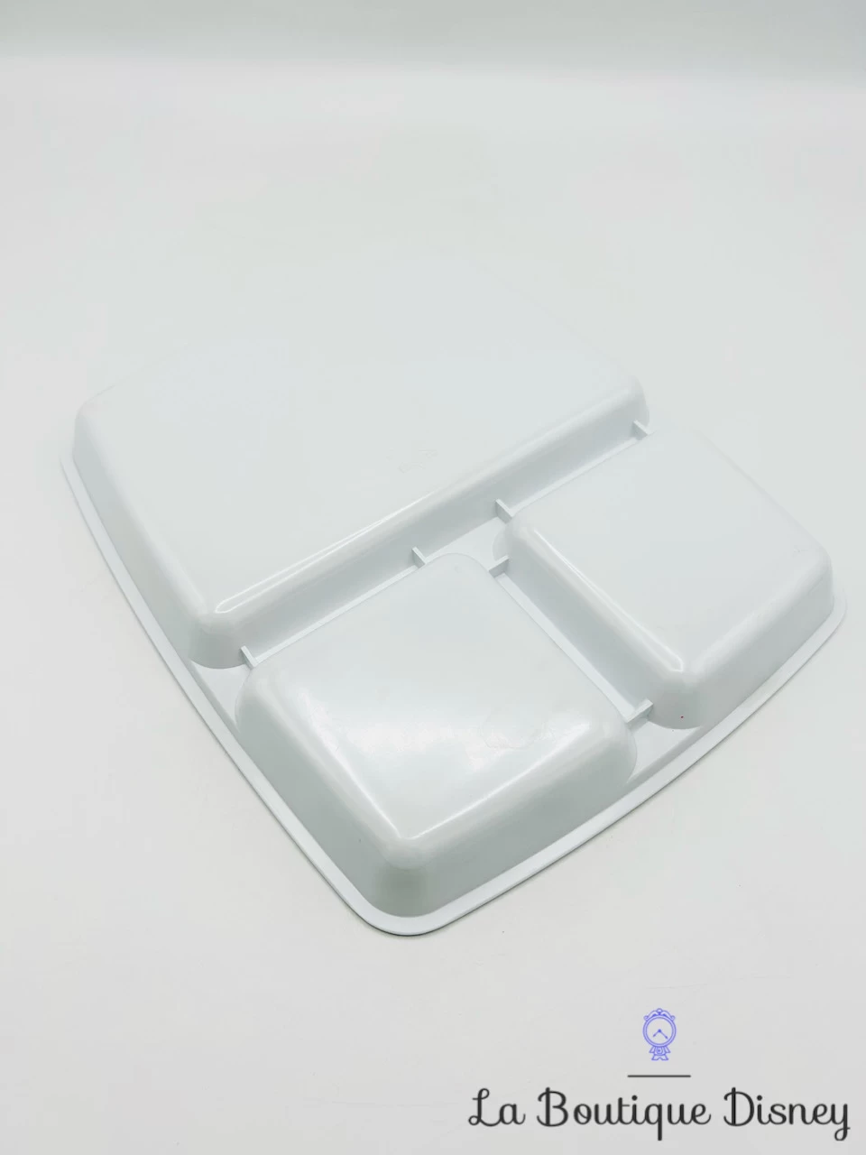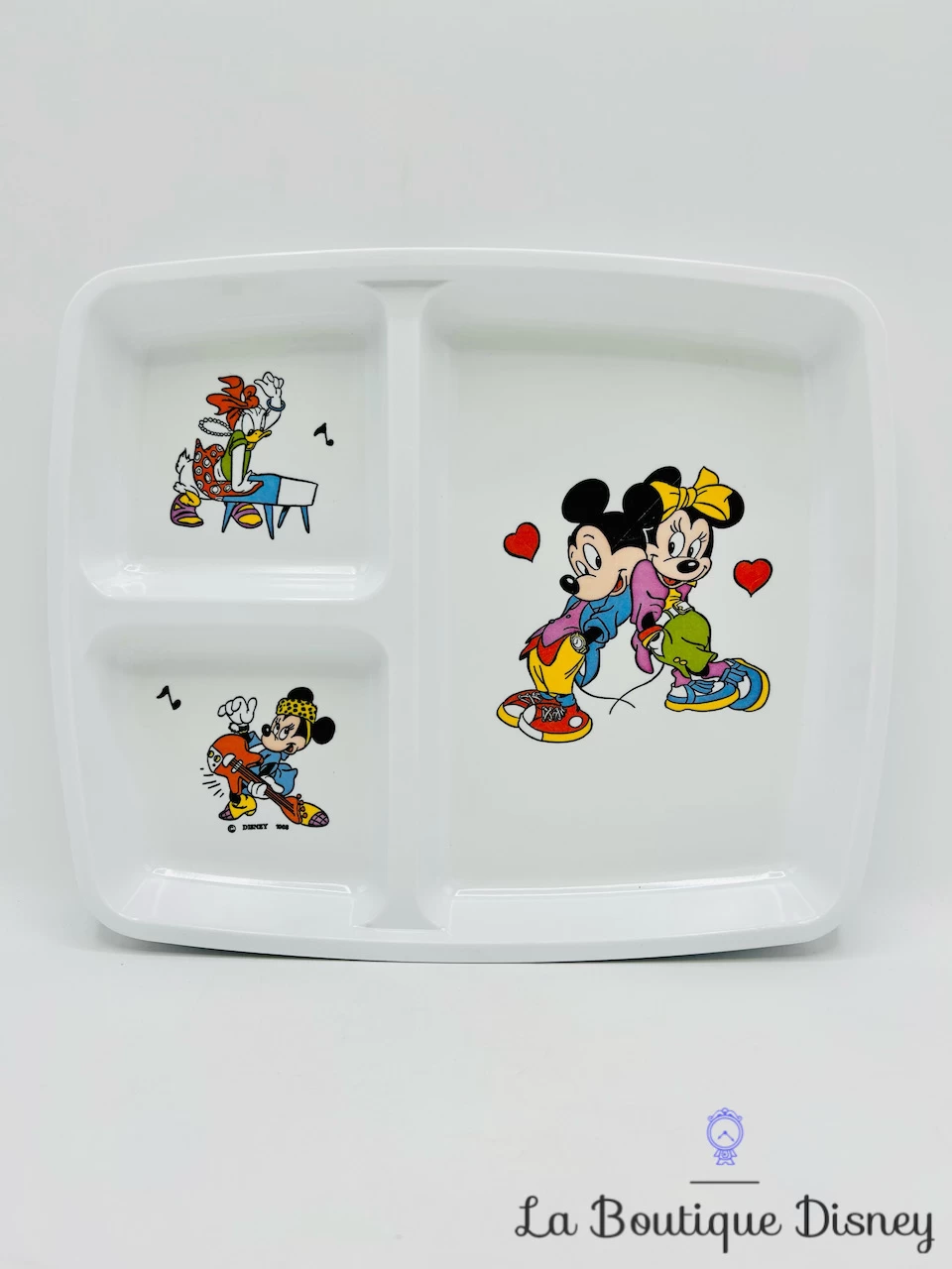 Assiette plate blanche en melamine comportant trois compartiments sur le thème de Mickey et ses amis. Il y a trois imprimĂ©s diffĂ©rents, un dans chaque compartiment Ă savoir : Mickey et Minnie adossĂ©s avec des coeurs rouges autour d’eux, Mickey jouant de la guitare Ă©lectrique et enfin Daisy. Â
