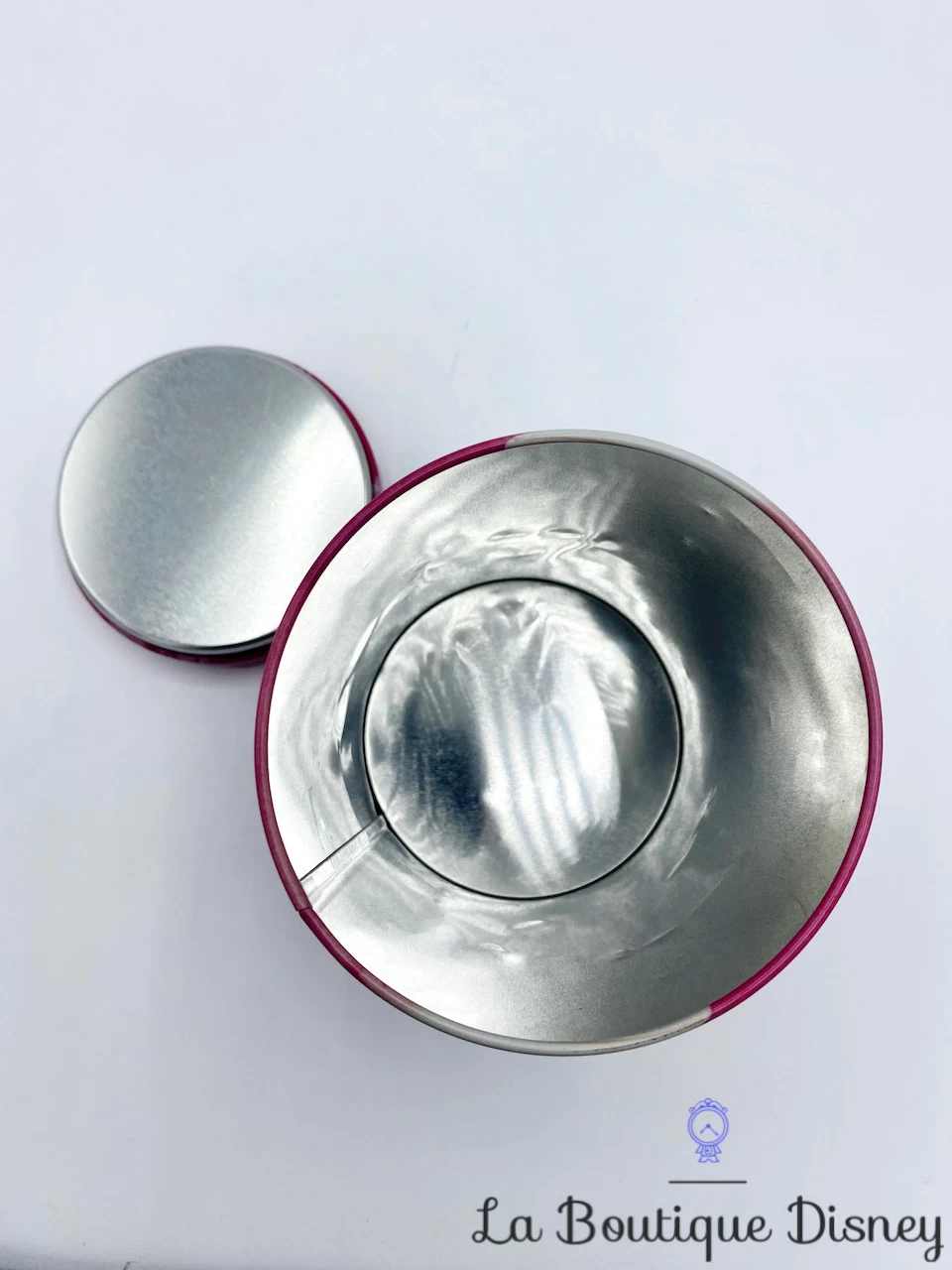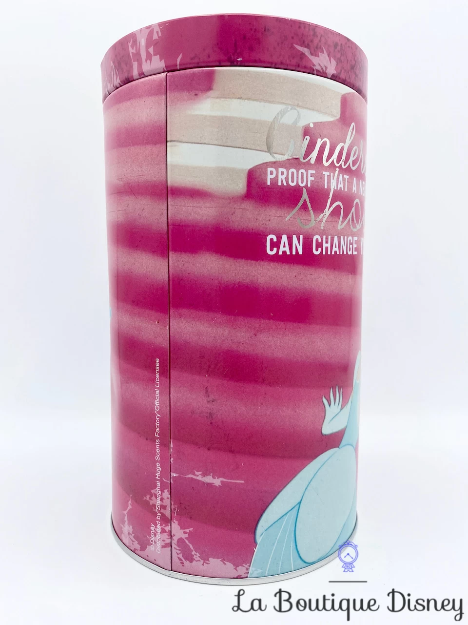 Boite en métal rose de forme ovale représentant la princesse Cendrillon dans sa robe de bal. Au dessus d’elle, il y a l’inscription en blanc et argenté « Cinderella proof that a new pair of Shoes can change your life ». Intérieur et dessous de la boite en métal argenté.