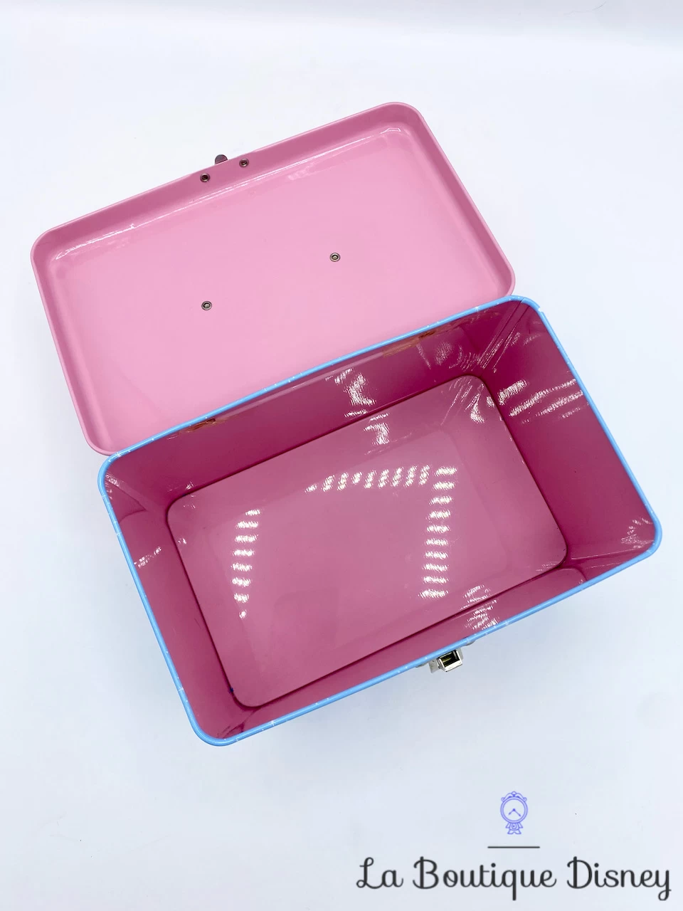 Boite en métal rose et bleue style coffre. Sur le dessus, une poignée rose permet de la transporter partout avec vous. Fermeture sur le devant grâce à un petit loquet. Couvercle rose avec inscription blanche « Cinderella Dreams Do Come True ». Contour de la boite bleu avec la représentation de la princesse Cendrillon et de son prince dans un coeur composé de noeuds. Espace de rangement assez grand à l’intérieur du coffre.