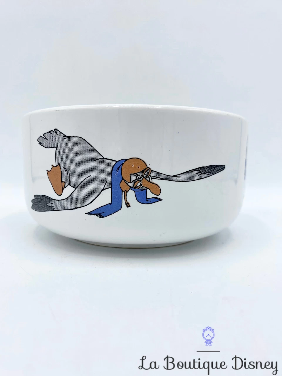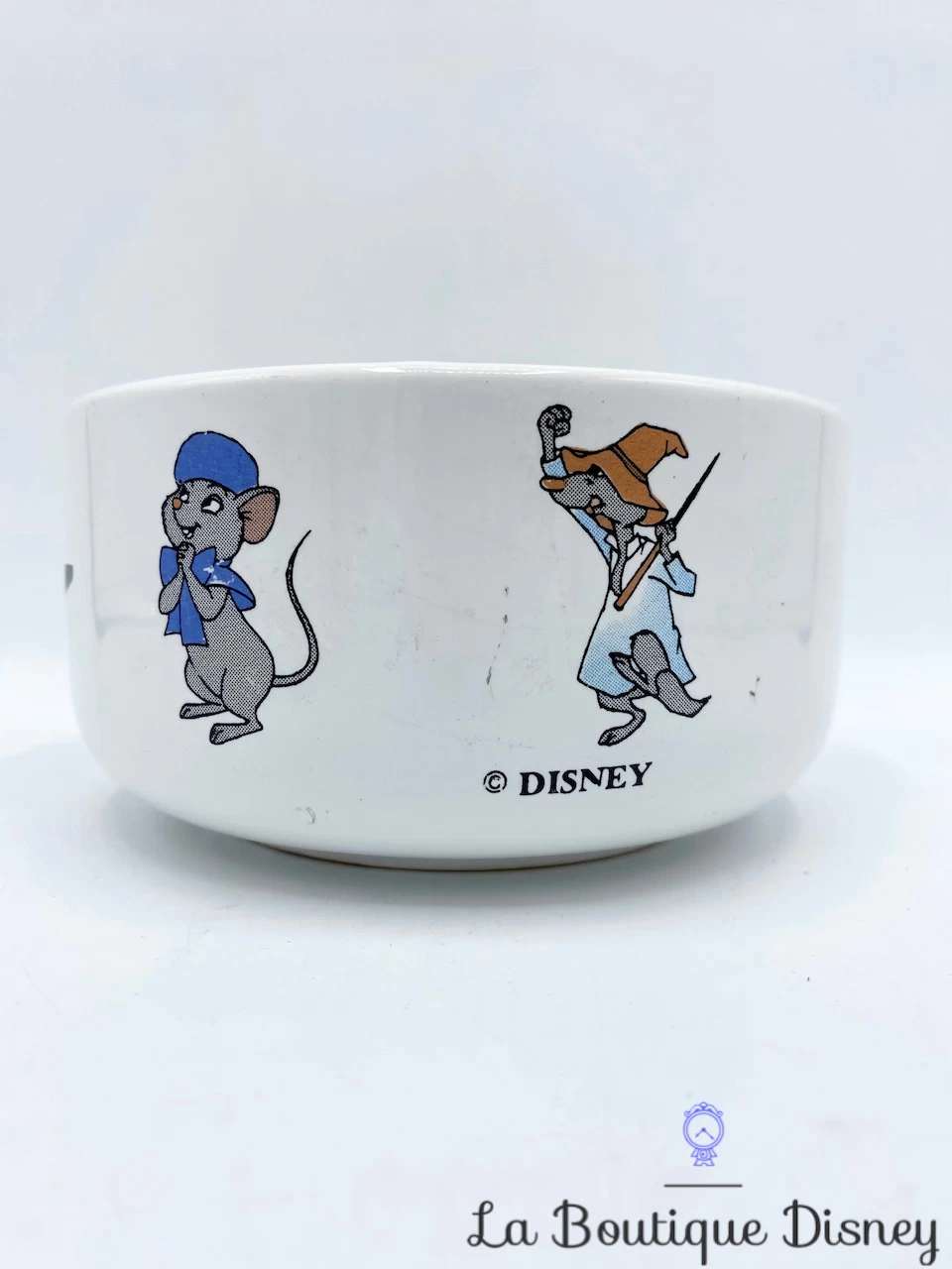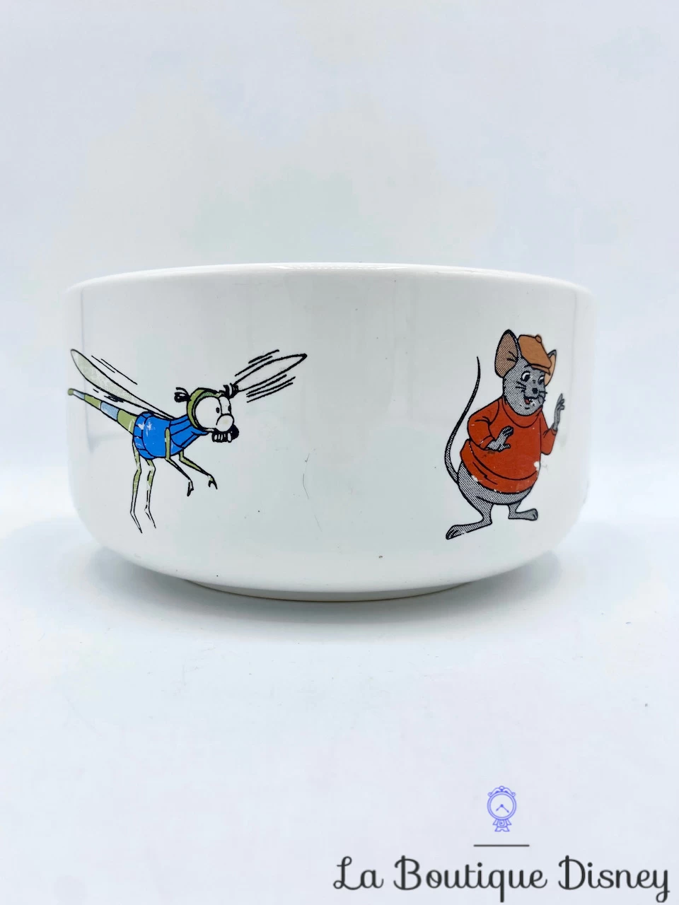 Bol blanc avec tout autour différents personnages du dessin animé Bernard et Bianca : il y a Bernard, le concierge à la SOS Société, Bianca la souris ambassadrice hongroise, Evinrude la libellule pilotant le bateau le plus rapide du bayou, Luke la souris vivant dans le bayou et Orville l’oiseau pilote « Albatross Air Service ».