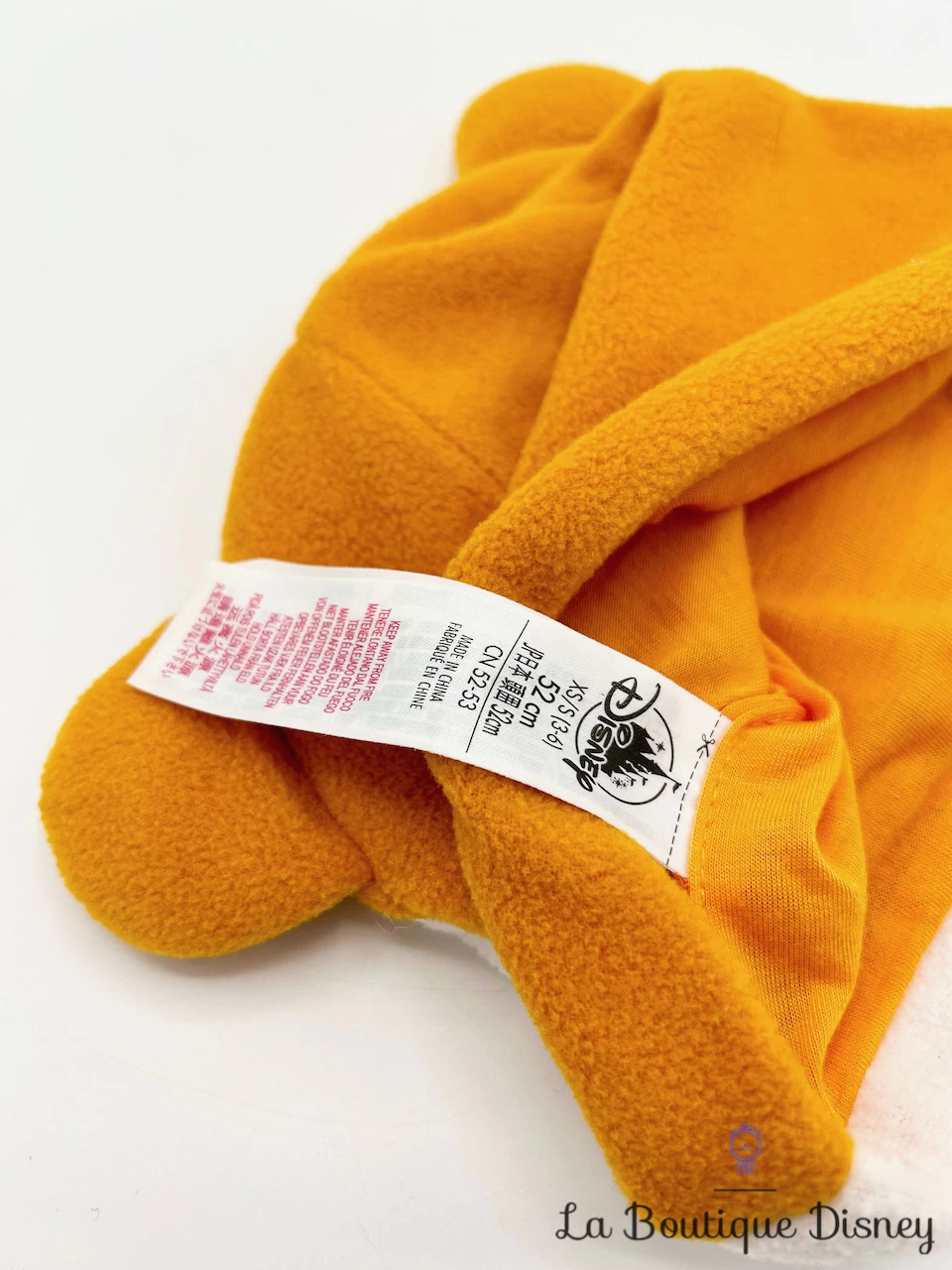 Bonnet en forme du haut du visage de Shere Khan, le tigre orange à rayures noires ennemi de Mowgli et Baloo dans Le Livre de la Jungle. Il a de jolis yeux noirs et jaunes, un museau orange, de grandes moustaches et deux petites oreilles. Intérieur du bonnet doublé polaire.