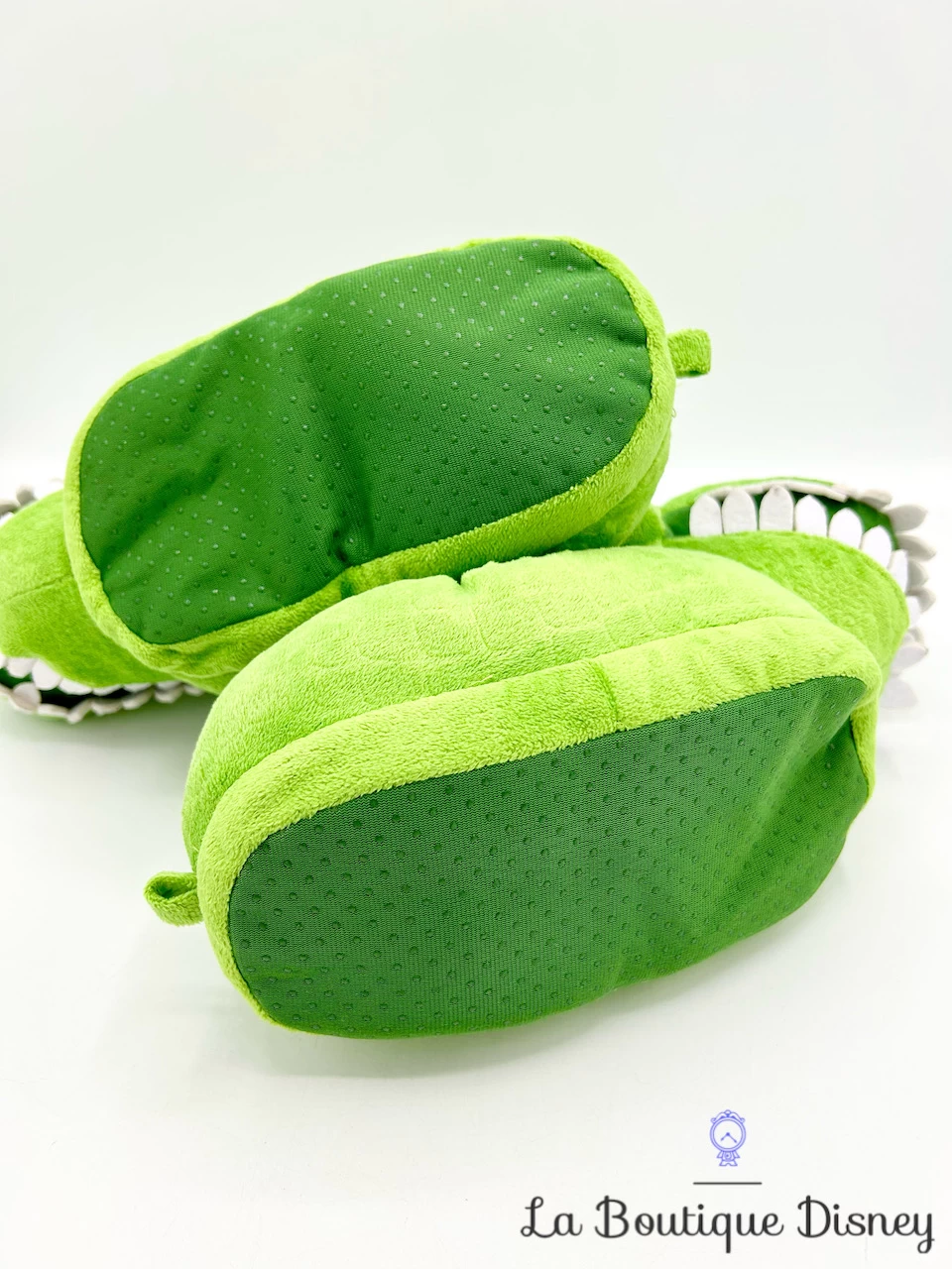 Pantoufles vertes représentant en relief la forme du corps du dinosaure vert Rex du dessin animé Toy Story. Son visage est brodé avec des yeux noirs et des dents en feutrine. Semelles antidérapentes.