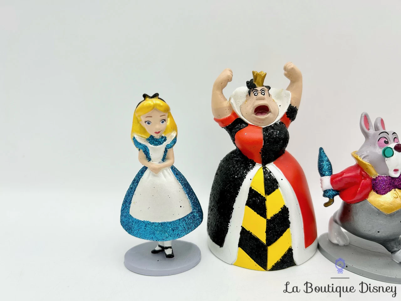 Ensemble de 4 figurines en PVC avec les personnages suivants : Alice dans sa robe bleue et blanche, la méchante Reine de Coeur, le Lapin blanc avec sa montre car il est toujours en retard et enfin les jumeaux Tweedle Dee et Tweedle Dum. Les figurines sont sur socles gris et sont de très belle qualité avec de nombreuses paillettes.
