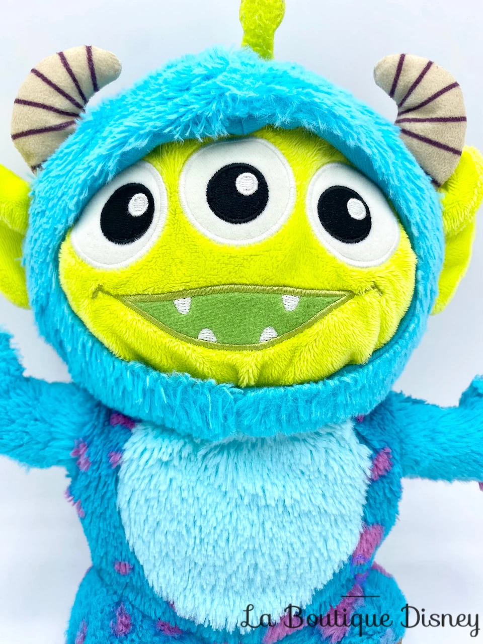 Peluche du célèbre petit extraterrestre vert Alien déguisé avec une combinaison de Sulli, le gentil monstre bleu à tâches violettes. Il est la Terreur d’élite de Monstres et Cie avec ses deux petites cornes et ses griffes marrons. Alien a 3 grands yeux noirs brodés, une bouche verte brodée avec des petites dents blanches.