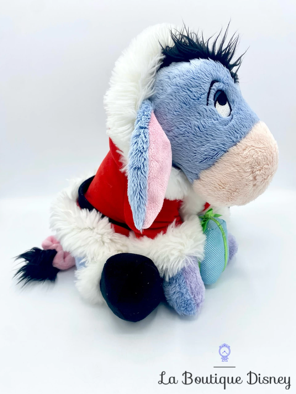 Peluche de Bourriquet sortie pour la saison de Noël par Disney Store. Bourriquet est habillé avec une tenue de Père Noël. Il porte un manteau rouge avec de la fourrure blanche. Entre ses pattes, il tient un cadeau bleu et vert. Écusson officiel « Disney Store Exclusive » à l’arrière de la peluche.