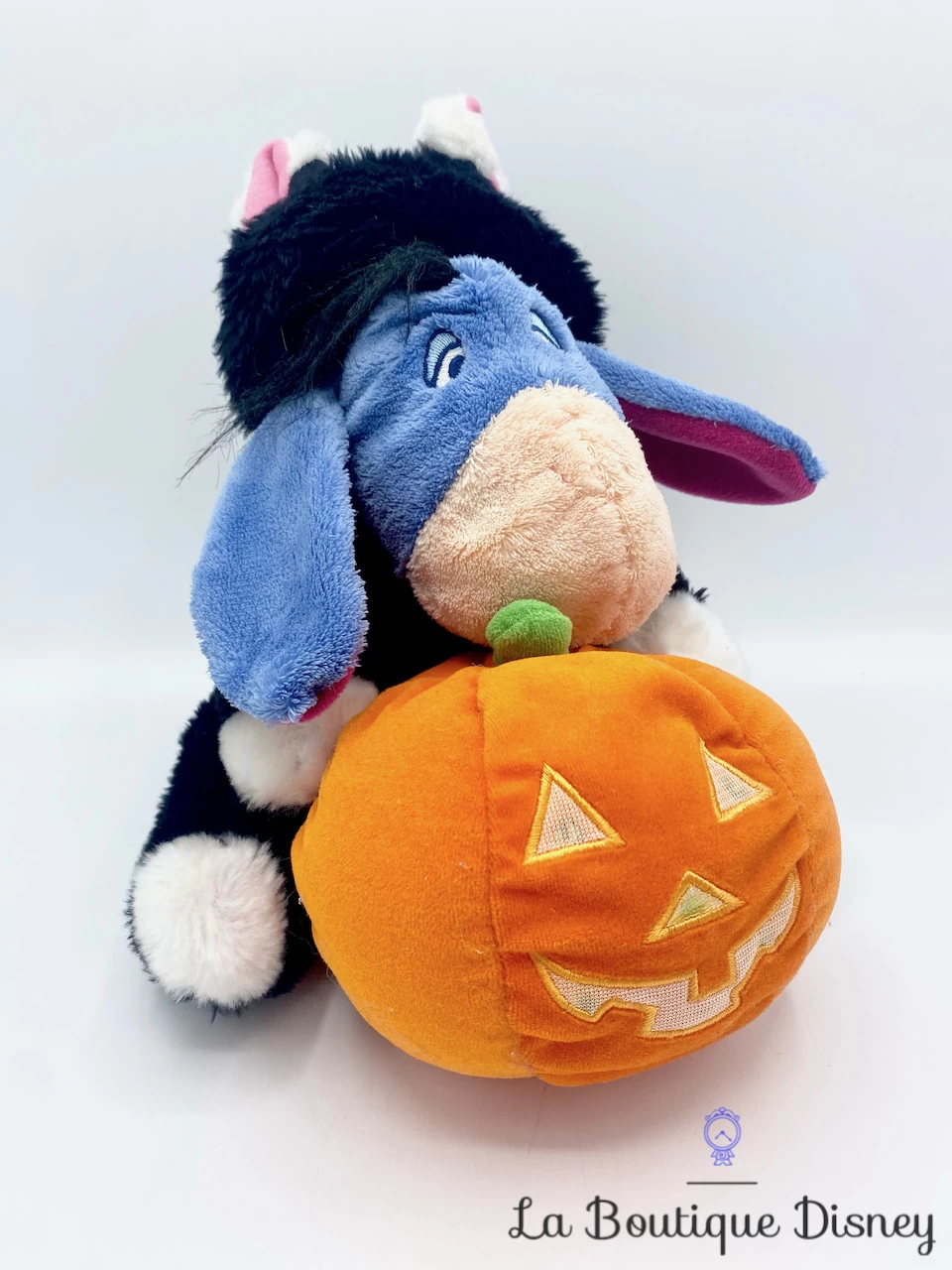Peluche en polyester de l’âne bleu violet ami de Winnie l’ourson, Bourriquet. Il est assis et a de longues oreilles roses. Il a des yeux bleus brodés. Il porte un déguisement d’Halloween noir en fourrure avec des petites oreilles de chat. Entre ses deux mains, se trouve une grande citrouille orange formant une tête. Sur le coté de la peluche est brodé en blanc l’année « 2002 ».