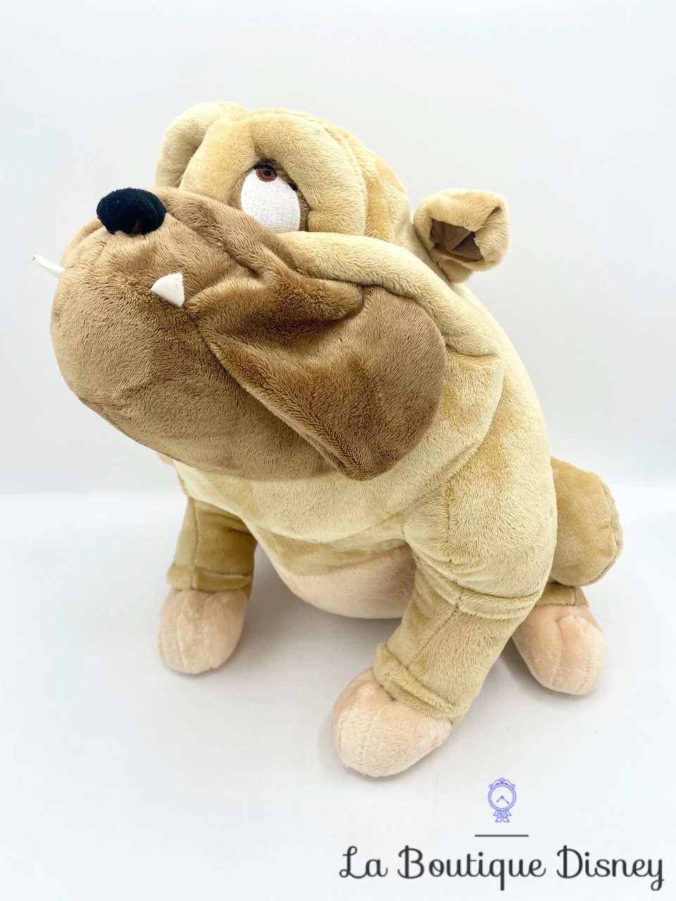 Peluche de Bull, le bouledogue anglais qui bave beaucoup. Il fait parti des chiens de fourirère du dessin animé qui seront libérés par Clochard. Il est beige et marron, a deux petits crocs en feutrine blanche et des yeux brodés. Écusson « Disney Store Original Authentic » sur le côté de la peluche.