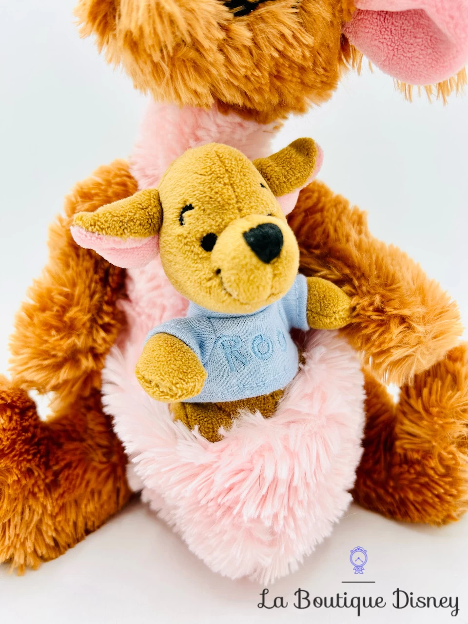 Peluche de Maman Gourou et Petit Gourou. C’est un grand kangourou marron. Elle a dans sa poche Petit Gourou, son fils. Il a de petites oreilles roses et porte un tee shirt bleu sur lequel est inscrit « Roo ». Écusson sous le pied de la peluche Disney Store Exclusive & Authentic.
