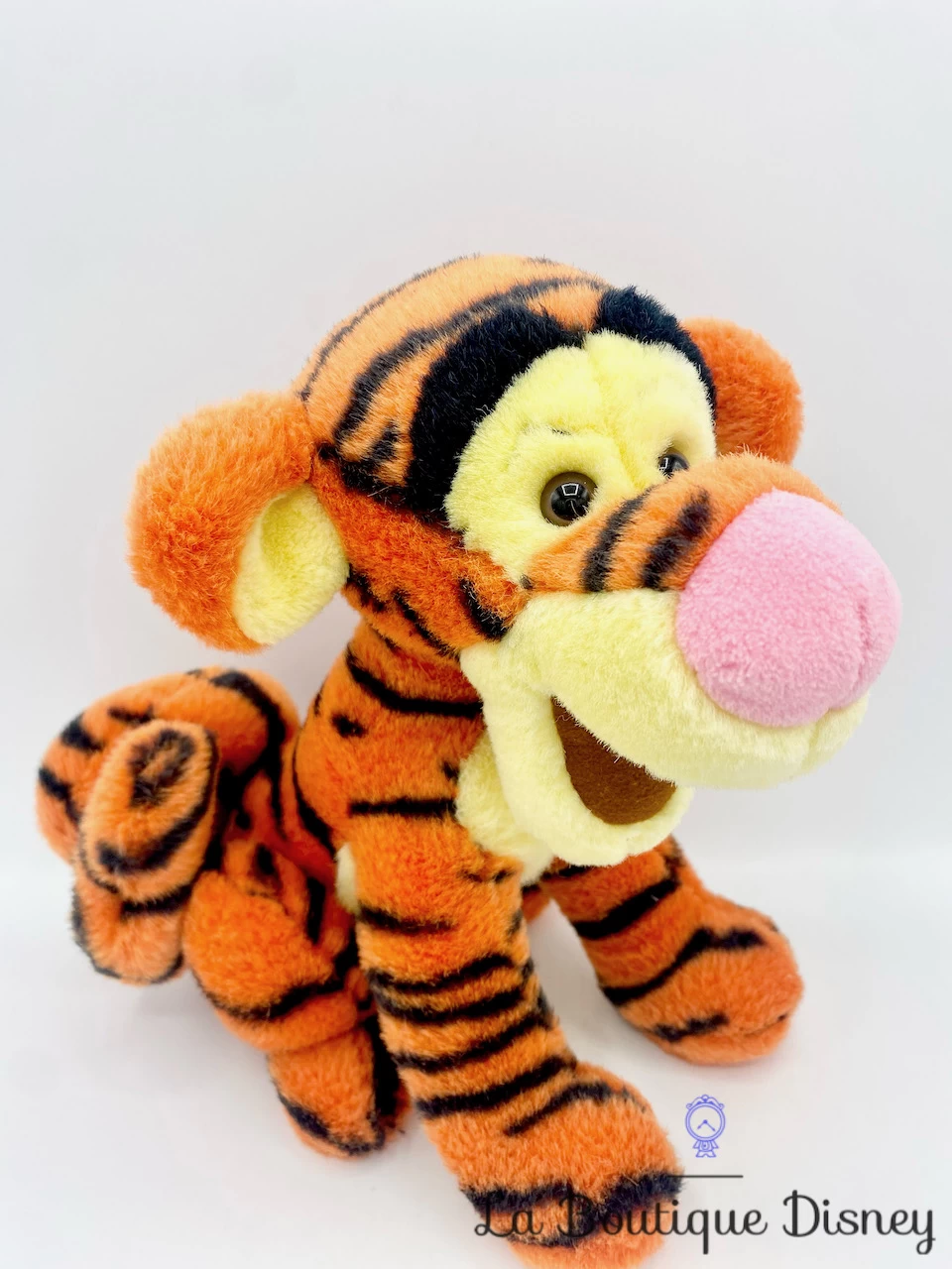 Peluche de Tigrou l’adorable tigre orange Ă rayures noires ami de Winnie l’ourson qui adore bondir avec sa grande queue en forme de tire bouchon dans la forĂŞt des rĂŞves bleus. Son corps est orange, son ventre jaune et il a des petits yeux en plastique marron. Peluche Ă©paisse de très belle qualitĂ©. Il est assis prĂŞt Ă vous faire de gros câlins !