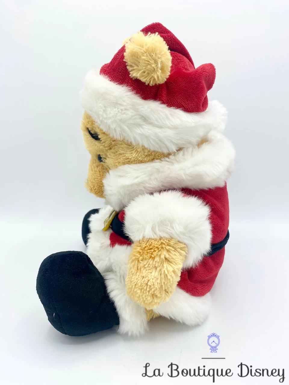Peluche représentant Winnie l’ourson dans une tenue de Père Noël. Il porte un manteau rouge bordé de fourrure blanche et une ceinture noire avec une boucle dorée. Il a des bottes noires à fourrure et un bonnet de Noël rouge avec un pompon blanc d’où en ressort ses deux petites oreilles jaunes. Ses yeux sont en plastique noir, ses sourcils, son museau et sa bouche sont en feutrine noire. Peluche idéale pour les fêtes de fin d’année ! Écusson Disney Store Exclusive & Authentic sous le pied de la peluche.