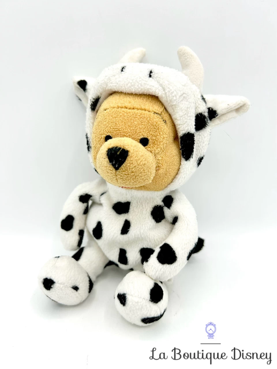 Peluche de Winnie l’ourson le petit ours jaune. Il est habillé avec un déguisement animal de vache. Sa combinaison est blanche à pois noirs et il est très mignon ! Effet grain billes / grains de riz pour le remplissage.