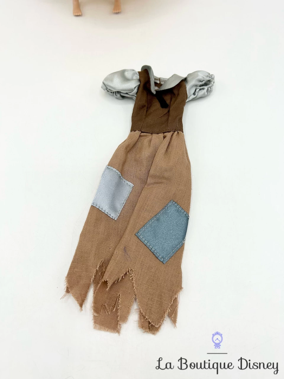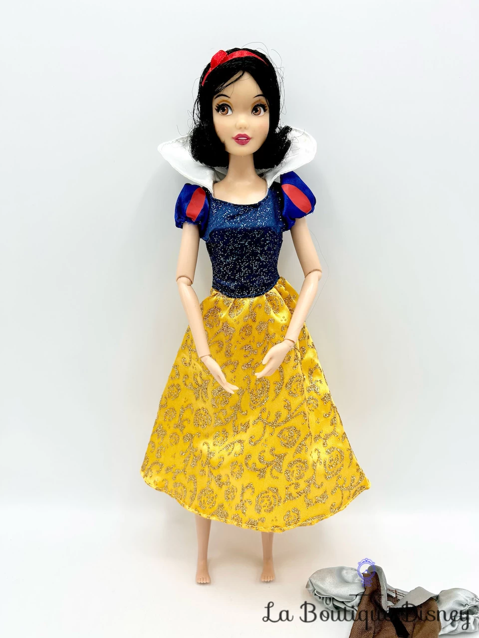 Poupée mannequin classique de Blanche Neige, la princesse avec une robe jaune et bleue. Le jupon de la robe est jaune à paillettes. Elle a un grand col satiné blanc et un haut à paillettes bleu. Cheveux noirs avec un petit bandeau rouge. Bras articulés. Blanche Neige possède également une tenue de rechange avec sa robe marron de souillon.