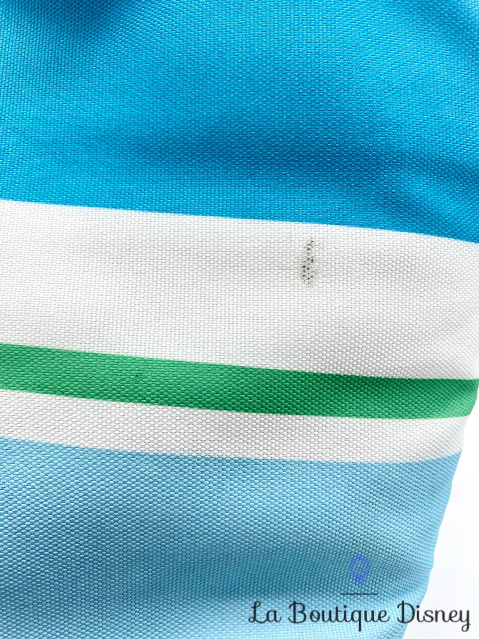 Sac isotherme avec grande pochette intérieure et petite pochette avec fermeture à l’avant. Extérieur du sac bleu, vert et blanc avec des rayures et la tête de Mickey Mouse en gros plan. Deux grandes anses rouges sur le dessus pour tenir le sac à la main ou pour le porter à l’épaule. Idéal pour transporter votre prochain pique nique !