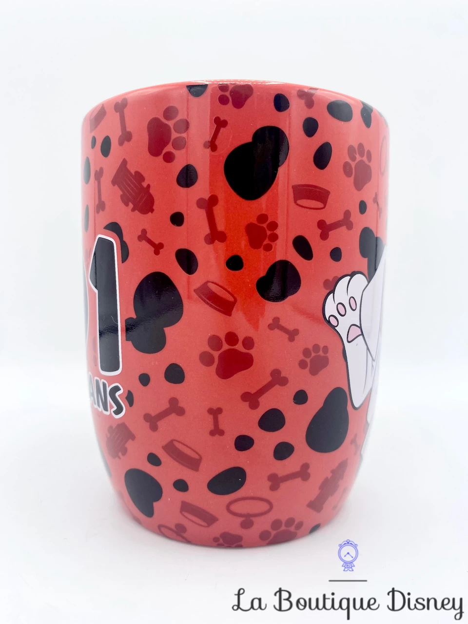 Mug en céramique rouge et noir avec une toute petite poignée sur le côté. Sur la première face, il y a un petit chien noir et blanc couché sur le ventre avec les pattes croisées. Sur l’autre face, il y a en noir l’inscription « 101 Dalmatians » avec une empreinte de patte à l’intérieur du « 0 ». Le fond de la tasse est rouge avec des tâches noires comme sur les chiots, et des motifs d’os, de pattes, de gammelles… Anse et intérieur rouges.