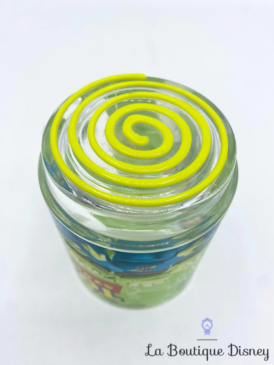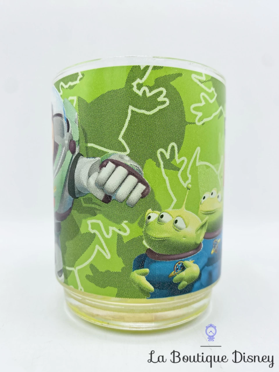 Tasse transparente avec un imprimé vert sur le thème de Toy Story. On peut y voir trois petits aliens extraterrestres ainsi que Buzz l’Éclair, le space ranger de l’espace. Un tourbillon vert sous le mug permet l’effet anti dérapant. Anse transparente.