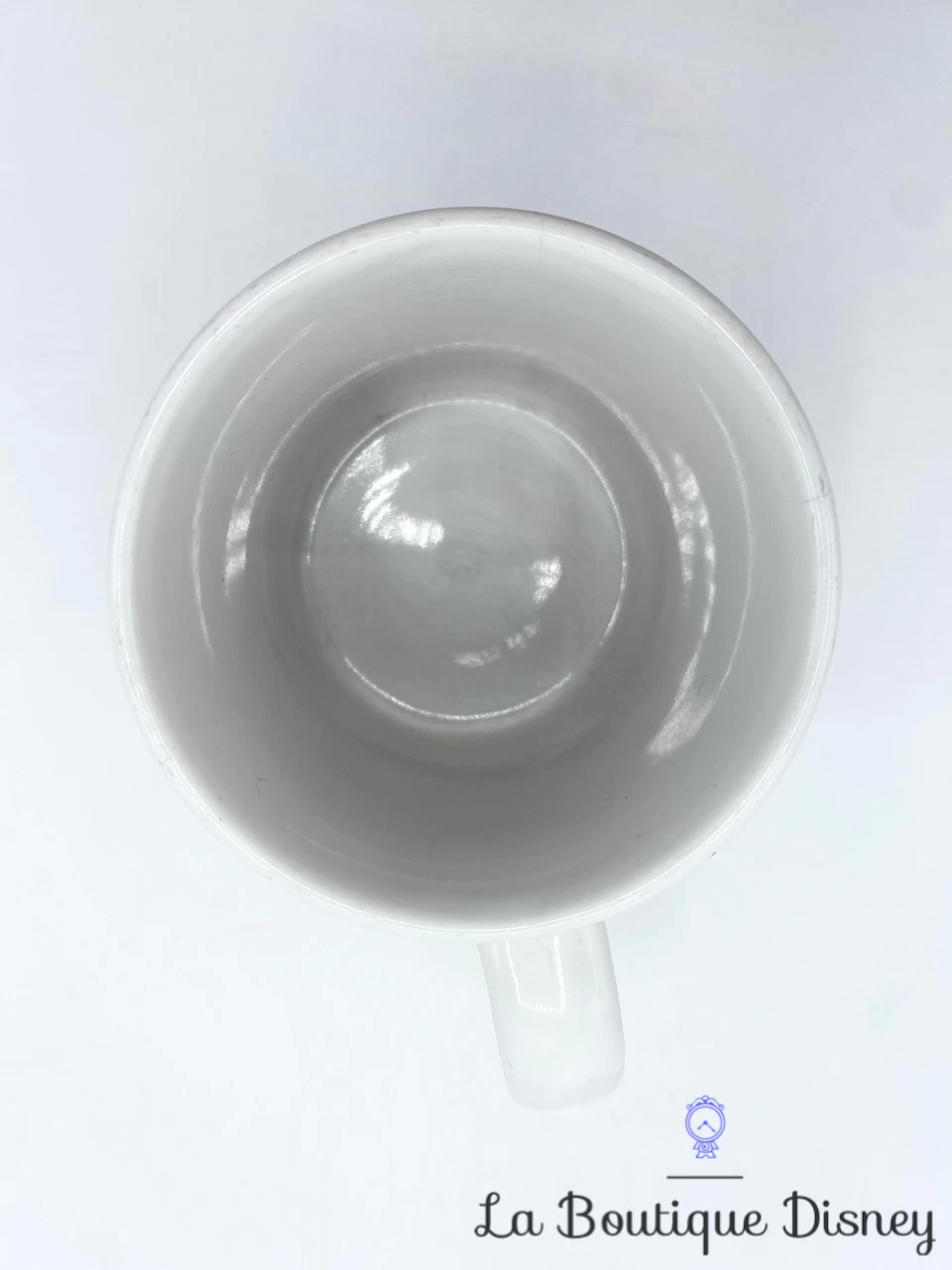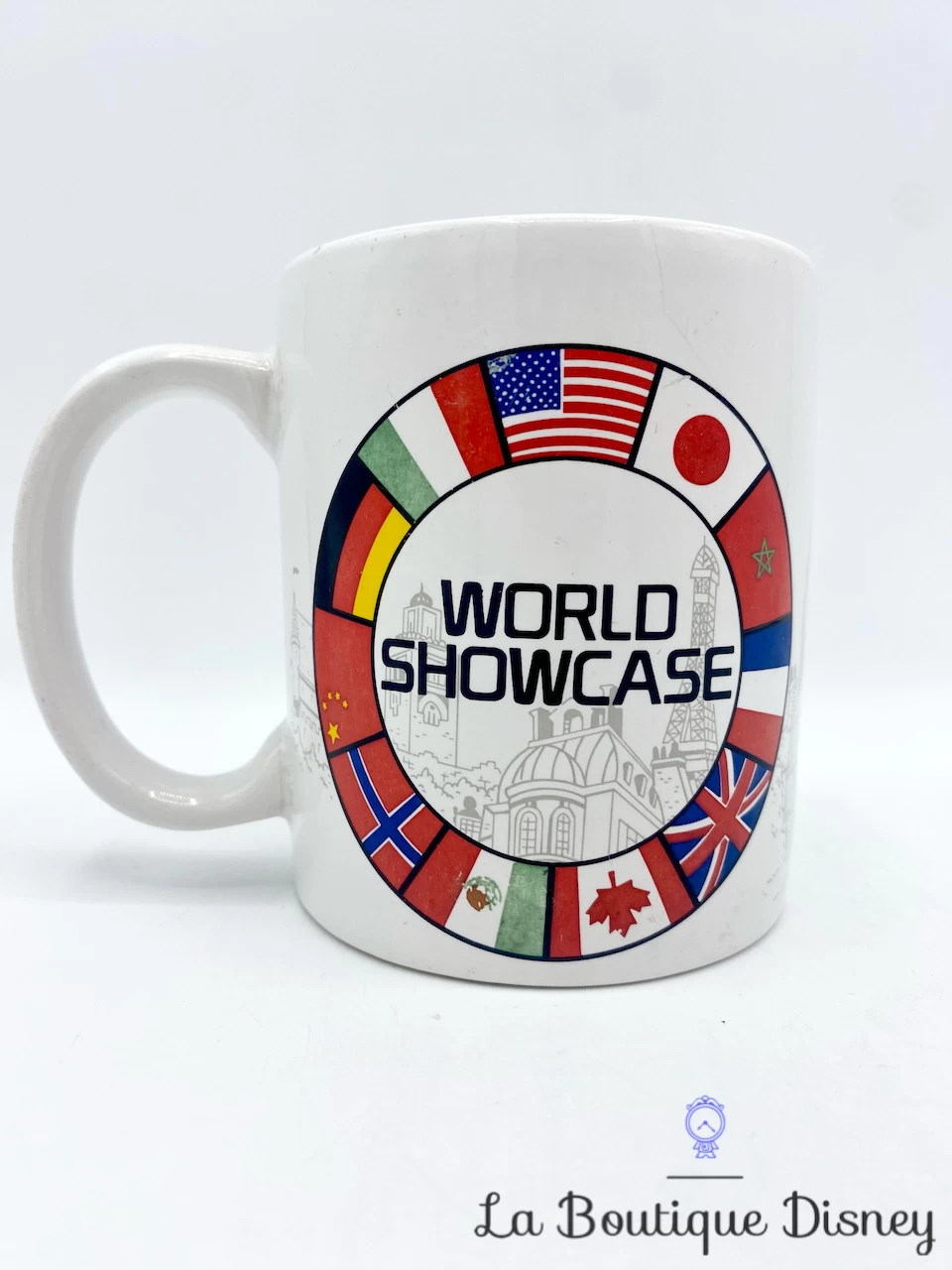 Mug en céramique blanc sorti dans le parc Epcot Center aux USA. Il y a la représentation de notre souris préférée Mickey Mouse portant une tenue à l’effigie de l’Oncle Sam, le symbole des Etats Unis. Au dessus de lui est inscrit « Grandpa » en noir. Sur l’autre face de la tasse, il y a l’inscription « World Showcase » en noir avec tout autour la représentation de différents drapeaux. Intérieur et anse blancs.