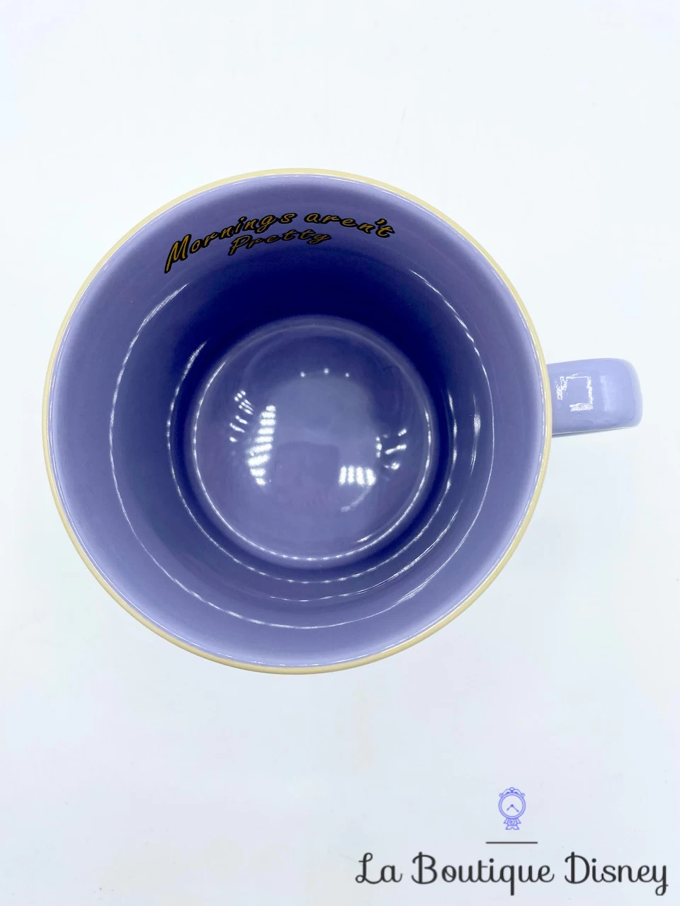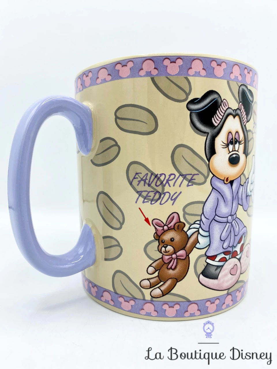 Tasse en céramique sur fond écru représentant la célèbre souris Minnie Mouse. En arrière plan, il y a une multitude de grains de café et un bandeau mauve avec des oreilles de Minnie roses sur le haut et le bas de la tasse. Minnie est vêtue d’une robe de chambre violette, de chaussons roses, a les oreilles en désordre et porte deux bigoudis roses sur la tête. Elle a l’air très fatiguée ce matin. Elle semble trainer dans sa main droite Teddy son ourson favori et tient une tasse fumante dans sa main gauche sur laquelle est inscrit « I hate mornings ». Plusieurs autres inscriptions sont notées autour du mug « Extra sweet », »Bed ears » et « Favorite Teddy ». Intérieur et anse de la tasse mauves avec une inscription « Mornings aren’t Pretty ». Tasse XXL très grande capacité !