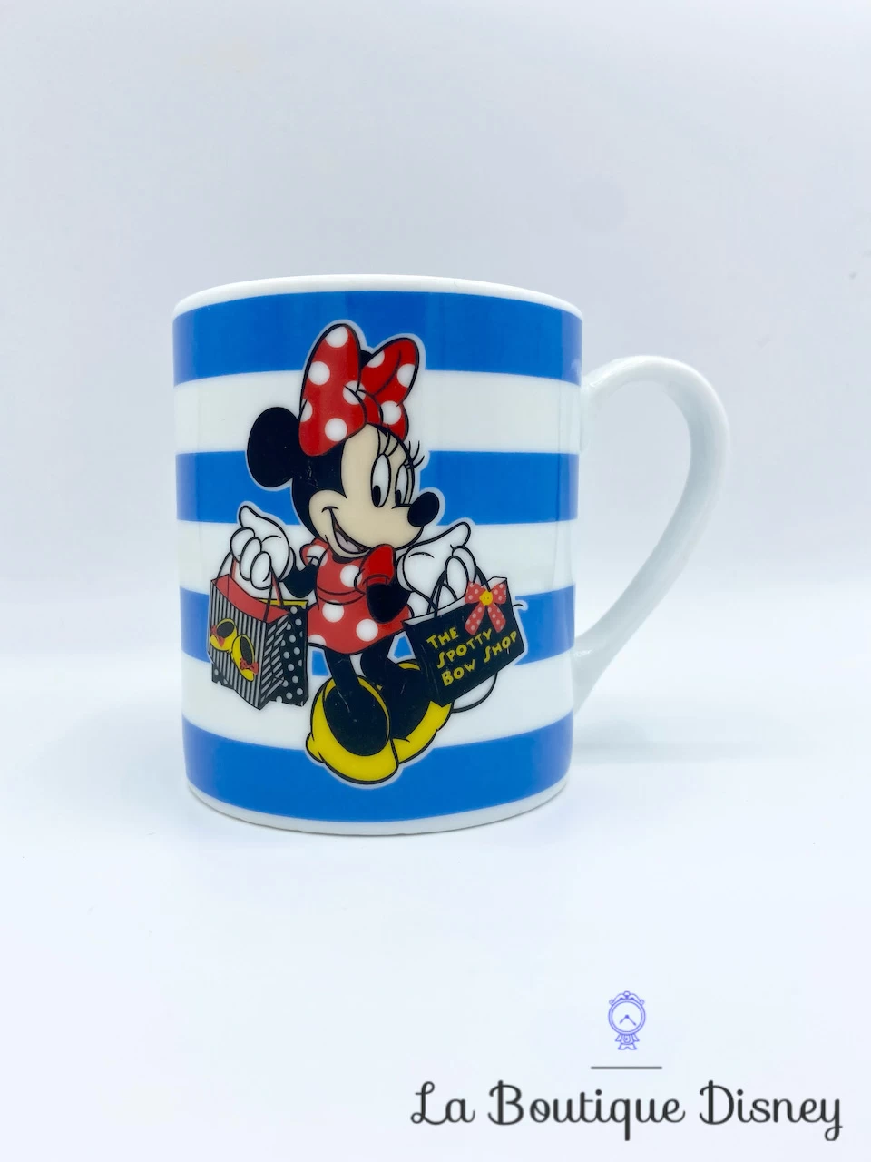 Mug Ă rayures blanches et bleues. Minnie Minnie est imprimĂ© dans sa tenue classique rouge Ă pois blancs et portant des sacs de courses : un sac Ă chassures et un sac « The Spotty Bow Shop ». Sur l’autre face, il. y a l’inscription « Minnie mouse » en lettre rouge.Â