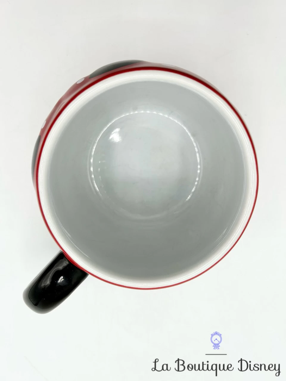 Mug en céramique rouge à pois blancs, avec le visage de Minnie Mouse dans le style Tsum Tsum. Elle a un visage très mignon avec un petit noeud rouge sur la tête. Anse noire. Intérieur de la tasse blanc.