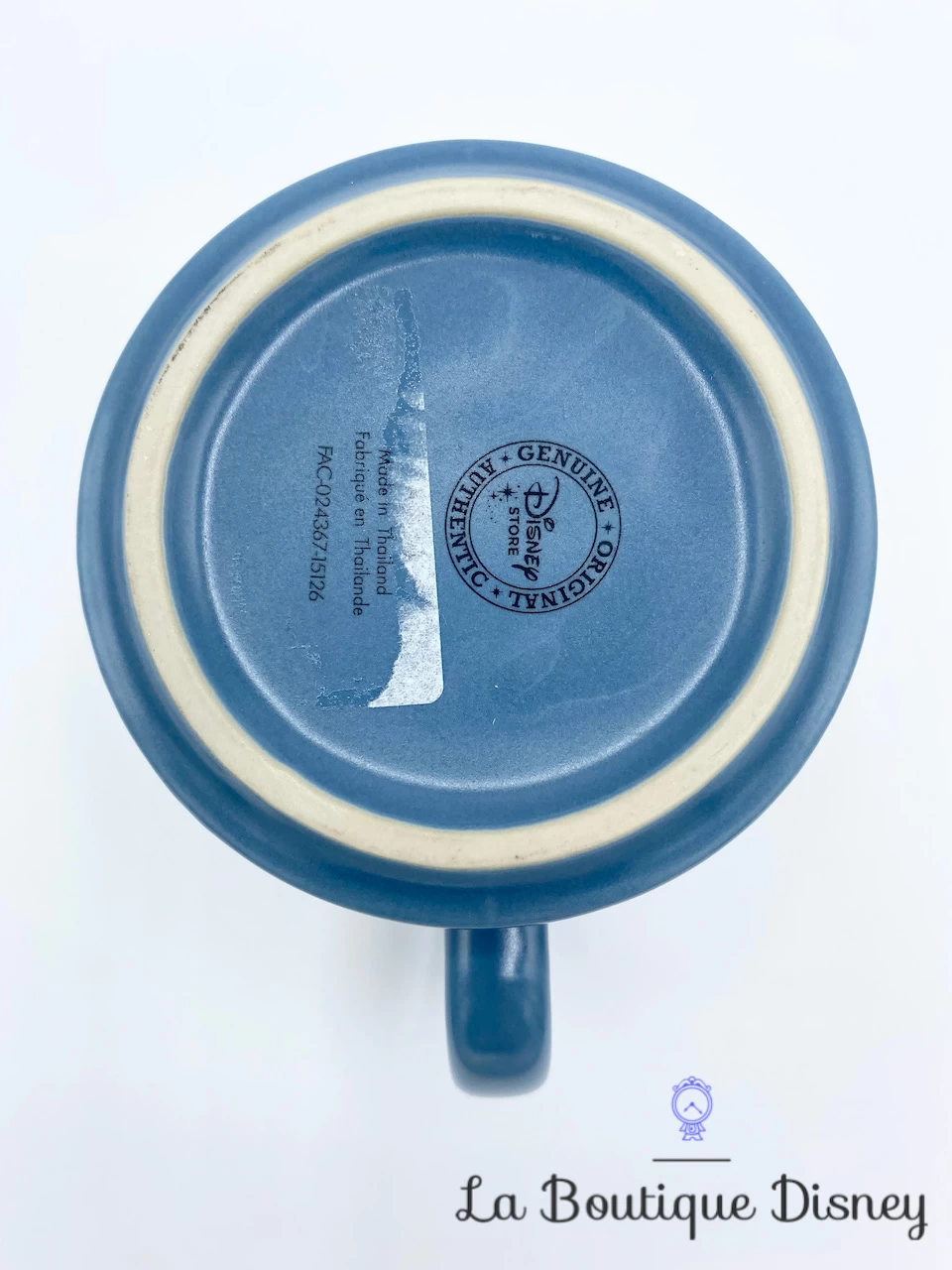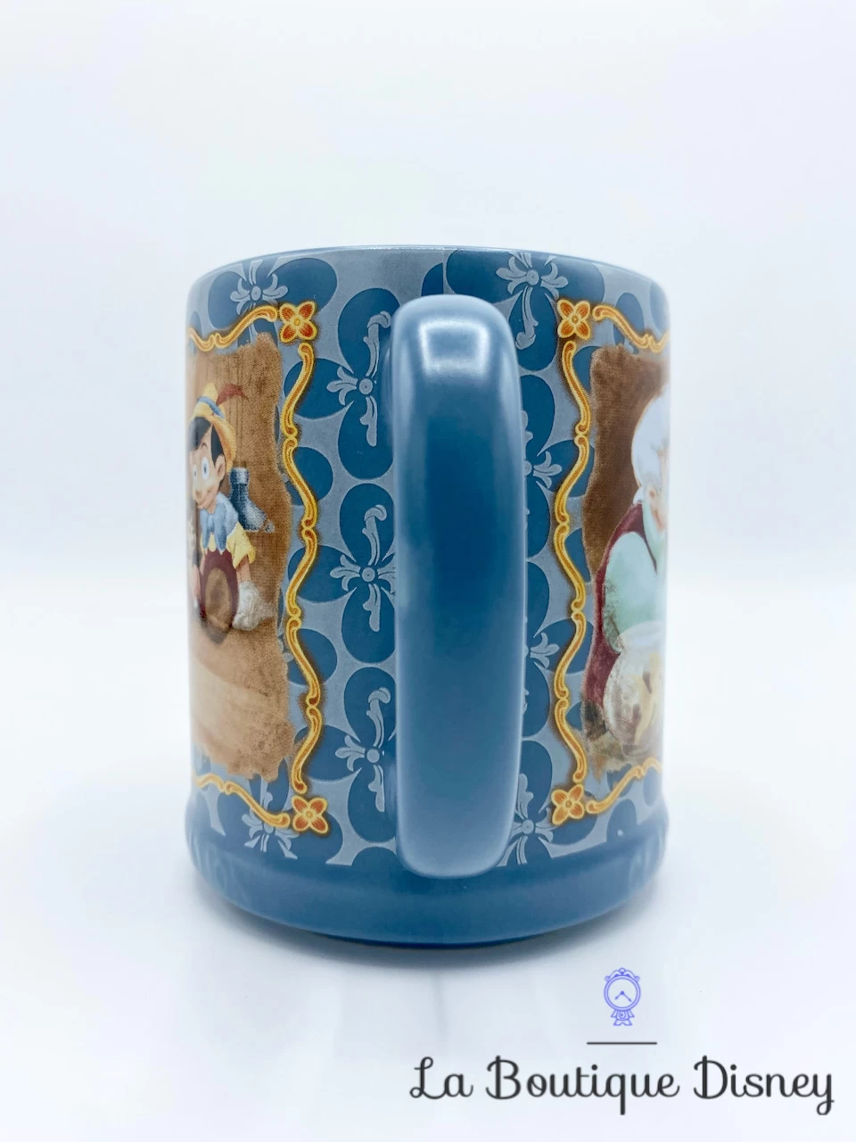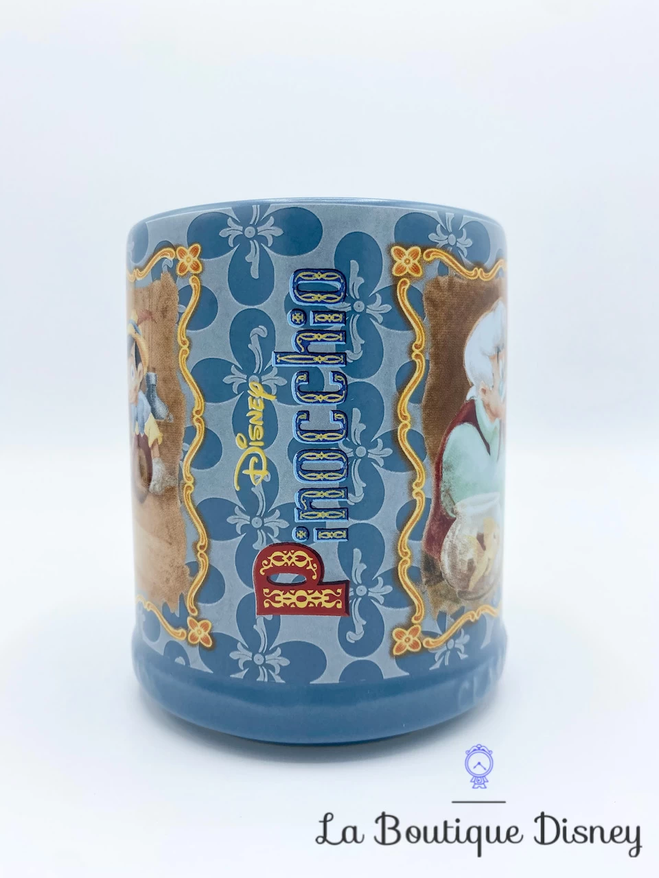 Mug en cĂ©ramique bleu reprĂ©sentant sur ses deux faces un dessin de Pinocchio, Gepetto et Figaro. Sur le cĂŽtĂ© est Ă©crit « Disney Pinocchio » avec la mĂȘme police qu’utilisĂ©e dans la bande annonce du dessin-animĂ©.Â