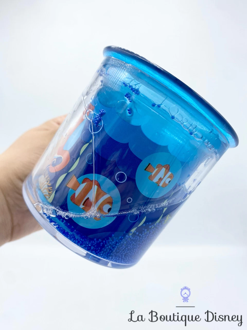 Mug plastique bleu et transparent sur le thème de l’eau. Des dessins en fond représentent Hank le poulpe, Némo le poisson ou encore Dory. La tasse possède une « double paroi » dans laquelle se trouvent de l’eau et des petites billes bleues qui se mettent en mouvement quand vous bougez la tasse.