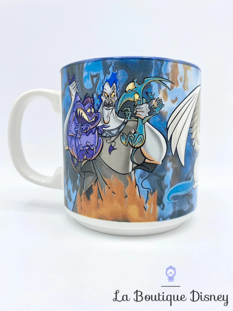 Mug en céramique bleu représentant une scène du film Hercule faisant tout le tour de la tasse. Il y a tout d’abord Hadès, le méchant du film tenant dans ses bras Peine et Panique au dessus du feu. Vient ensuite Pégase, le cheval blanc ailé et Philoctète le satyre. Pour finir, il y a Mégara tenant une fleur dans la main et Hercule en train de faire une démonstration de force en gonflant ses muscles. Le fond de la tasse est recouvert de paysages grecs. Intérieur bleu.