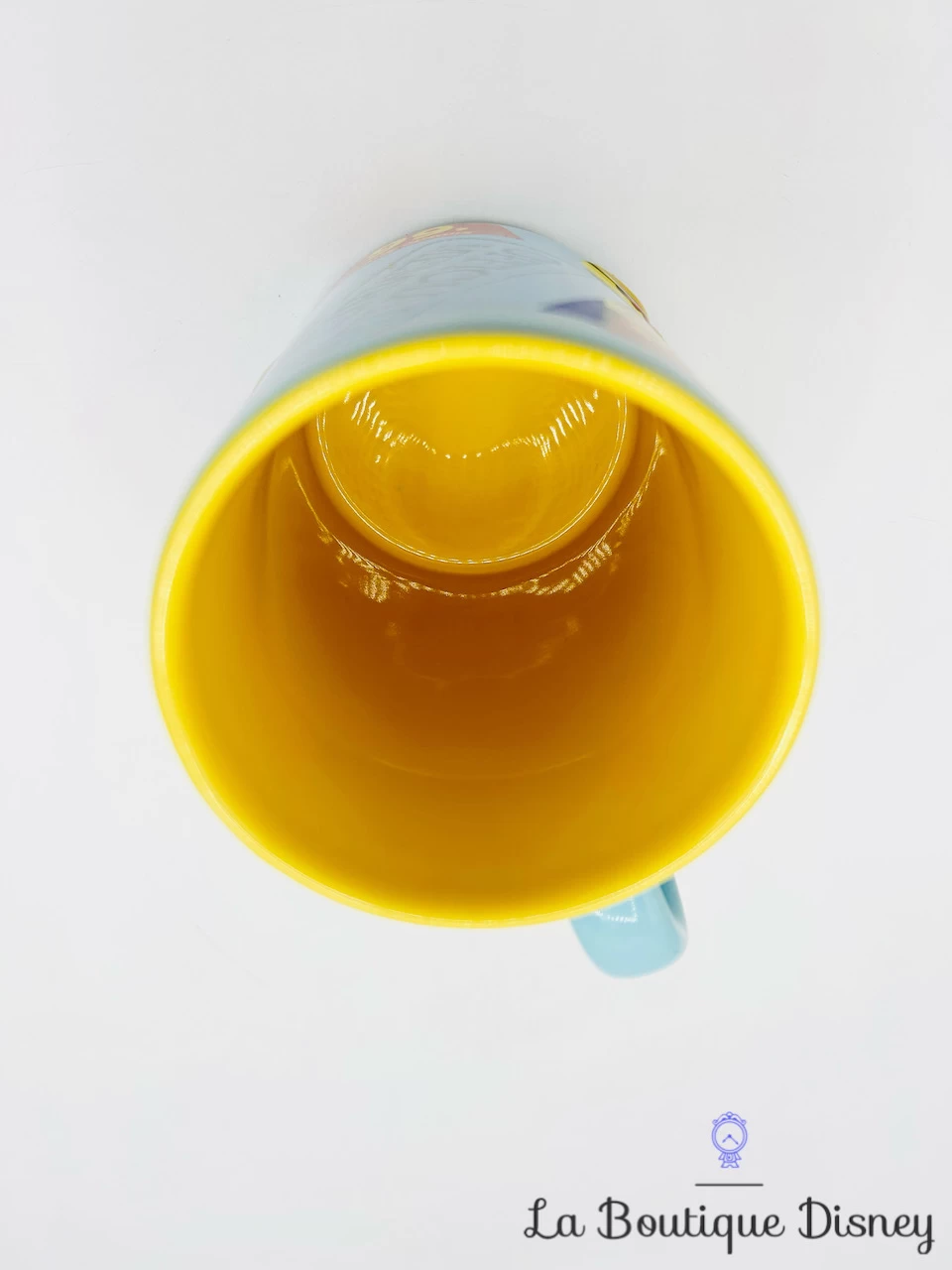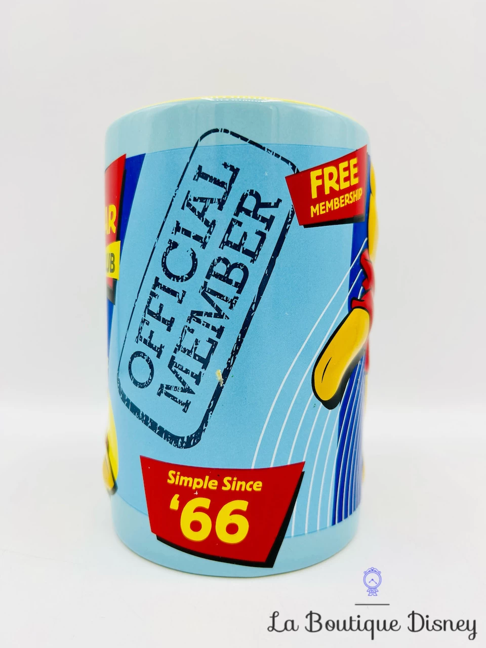 Mug en céramique bleu ciel représentant le petit ourson Winnie en léger relief 3D. Il y a différentes inscriptions dans des encadrés jaunes et rouges comme « The Pooh Bear Club », « Official Member », « Simple Since 66 », « Free Membership », « Must love hunny », « Kind to everyone », « Round and cuddly » et « Not too keen on bees ». Anse bleu ciel. Intérieur jaune.