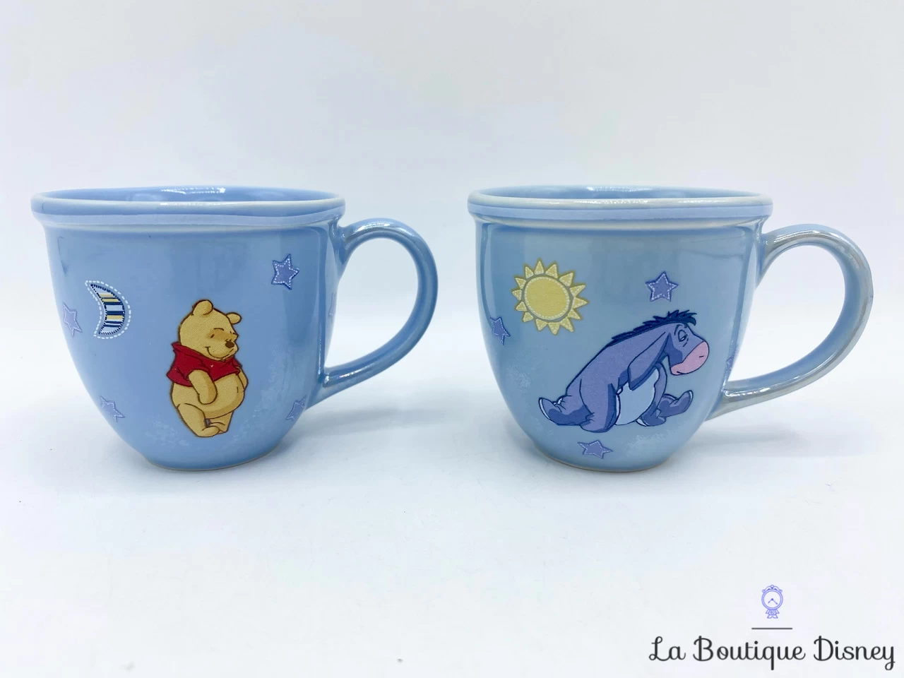 Lot de deux tasses en céramique représentent Winnie l’ourson et Bourriquet au format expresso. Les deux mugs sont bleu clair. Sur la première, il y a l’âne bleu violet Bourriquet. Il est assis et autour de lui se trouvent de nombreuses petites étoiles et un soleil. Sur la deuxième tasse, Winnie l’ourson se tient debout à côté d’une lune et d’étoiles. A l’intérieur des tasses figure l’inscription « Breakfast Club ». Anses et intérieurs bleus.