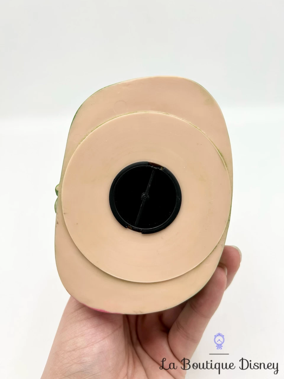 Tirelire en plastique représentant la princesse Aurore dans sa robe de bal rose. Elle est assise sur le sol devant l’emblématique château entourée de fleurs et de verdure. Fente à l’arrière pour insérer la monnaie. Bouchon récupérateur sous la tirelire.