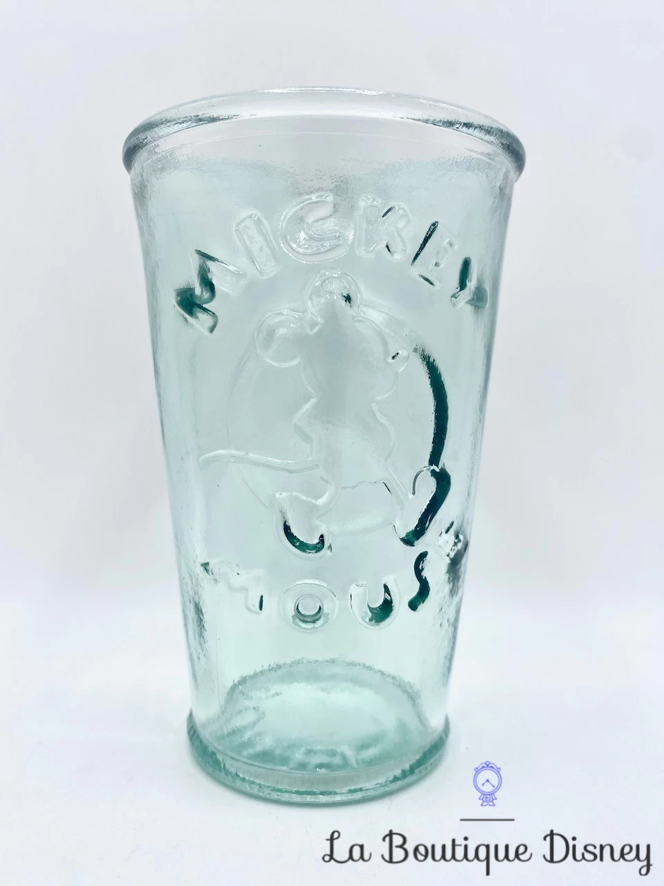 Verre transparent effet bleu ciel En relief 3D, il y a la silhouette de Mickey Mouse avec l’inscription « Mickey Mouse ». Verre très épais.