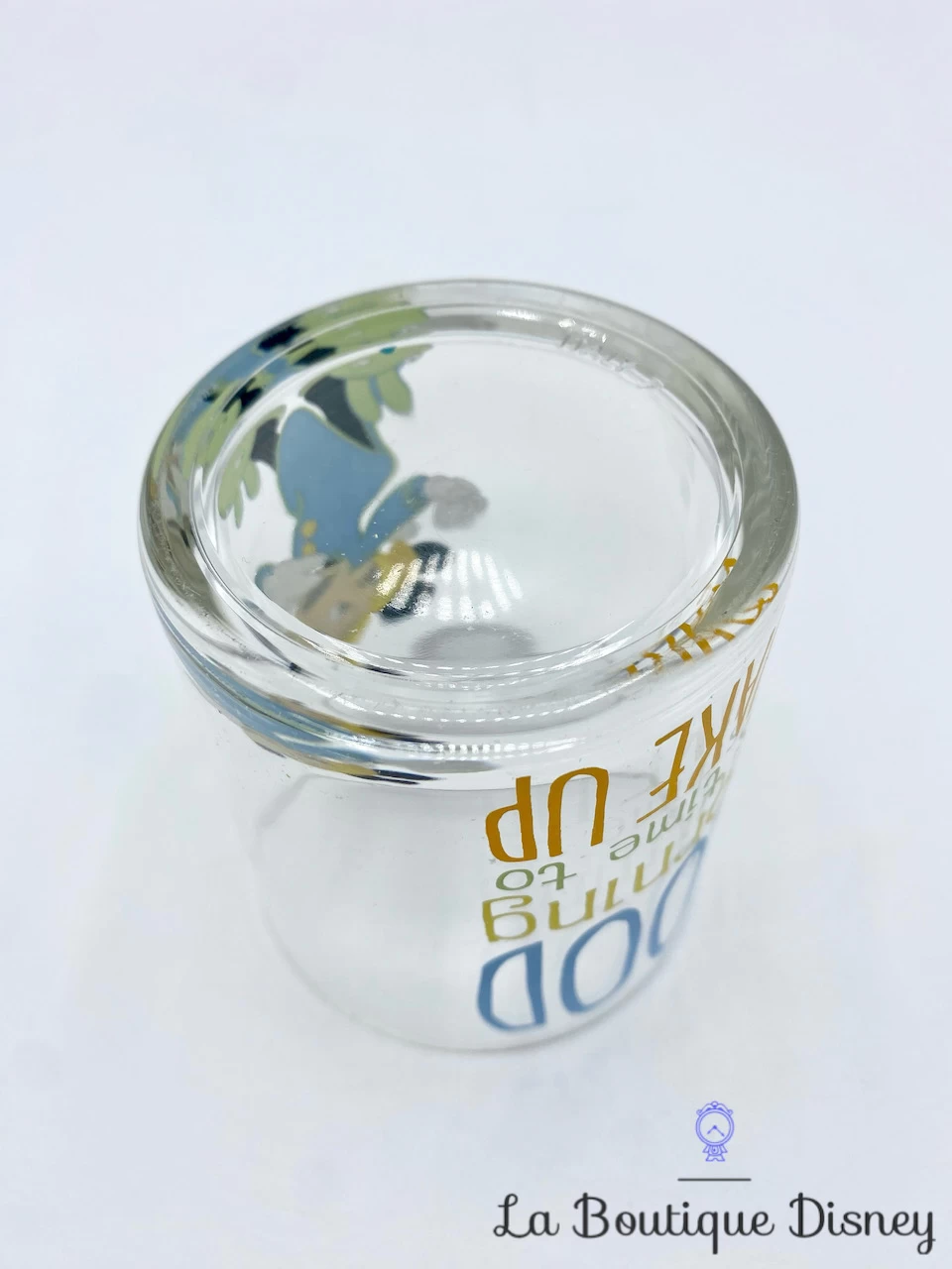 Verre transparent avec sur le devant Mickey Mouse en pyjama bleu, avec un bonnet de nuit jaune et des chaussons lapins verts. Il est en train de bailler. De l’autre côté du verre, est inscrit « Good Morning it’s time to wake up ».